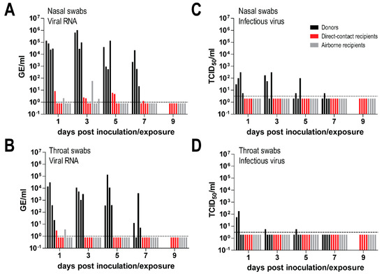 Shedding of Middle East respiratory syndrome coronavirus (MERS-CoV) RNA and infectious virus in directly inoculated, contact-exposed and airborne-exposed rabbits. MERS-CoV RNA and infectious virus were measured in the nasal (A,B) and throat swabs (C,D). The amount of viral RNA is displayed in genome equivalents per mL (GE/mL), while infectious virus is shown as 50% tissue culture infective dose per ml (TCID50/mL). Dashed lines depict the detection limit of each assay.