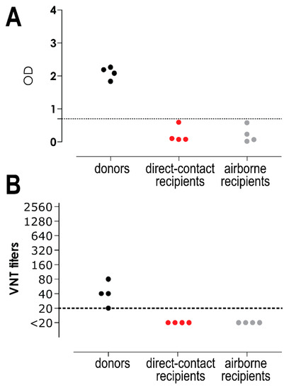 To study MERS-CoV transmission, four Netherland dwarf rabbits were intranasally inoculated with MERS-CoV. Six-hours later, each of them was co-housed with one naïve rabbit in the same cage, and 24 h later another one was co-housed in an adjacent cage to determine whether MERS-CoV could be transmitted through contact and/or airborne routes. Nasal and throat swabs were collected every other day up to day 7 or 9 post inoculation/exposure for the donor and direct contact rabbits, respectively, and day 9 post exposure for the airborne recipient ones. Both viral RNA and infectious virus were quantified in these samples. We found that all donor rabbits shed high loads of viral RNA in both the nasal swabs (~105–106 TCID50 GE/mL) and the throat swabs (~103–104 TCID50 GE/mL). The amount of viral RNA shed by the inoculated rabbits remained high until day 7 post inoculation. On the other hand, recipient rabbits housed in the same cage (direct contact recipients), or adjacent cage (airborne recipients), shed limited amounts of viral RNA (~10 TCID50 GE/mL) in both nasal and throat swabs. Among four animals in each group, only two direct contact recipient and two airborne recipient rabbits had detectable viral RNA up to day 5 post inoculation in the nasal swabs, while in the throat swabs, viral RNA was only detected in one direct contact recipient and one airborne recipient rabbit at day 1 post inoculation (Figure 5A,B). Infectious virus was detected at low level (~102 TCID50/mL) both in the nasal and throat swabs of the donor rabbits; in the nasal swabs of all donor rabbits at day 1 post inoculation, and in one of the donors up to day 7. In the throat swabs, infectious virus was only detected in two donors on day 1, up to day 5 in one of them. In contrast, none of the swabs from recipient rabbits was positive for virus titration (Figure 5C,D). Serological analysis of samples collected 14 days after exposure showed that only the donor rabbits seroconverted and developed neutralizing antibodies (Figure 6A,B). The antibody response of these directly inoculated rabbits was relatively low, confirming the results of previous studies [15,21]. This indicates that these rabbits developed MERS-CoV infection while the contact and airborne-exposed rabbits did not, supporting the results of the virus titration.