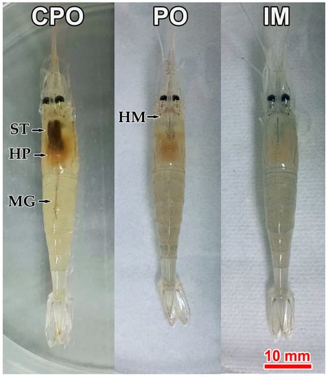 Gross signs of prawns Exopalaemon carinicauda in different groups of the challenge test. CPO: Prawn in per os control group; PO: Prawn in per os group; IM: Prawn in intermuscular injection group. Solid arrows indicate stomach (ST), hepatopancreas (HP), midgut (MG), and hematopoietic tissue (HM). Red bar = 10 mm.