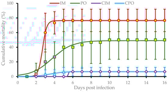 Cumulative mortalities of Exopalaemon carinicauda in the challenge test. IM group, prawns were challenged with filtrated viral suspension via intermuscular injection; PO group, prawns were fed with tissues of DIV1-infected P. vannamei; CIM group, prawns were injected with sterile PPB-His buffer; CPO group, prawns were fed with commercial feed. Cumulative mortalities are shown as means of data from three replicates for each experimental group (each replicate contained 10 individuals). The mean points with same color indicate no significant difference (P > 0.05), and the mean points with different colors indicate a significant difference (P < 0.05). Overall analysis indicated there are very significant differences among IM, PO, and the two controls (P < 0.01). The curves were drawn based on the nonlinear regression following the three-parameter sigmoid equation.