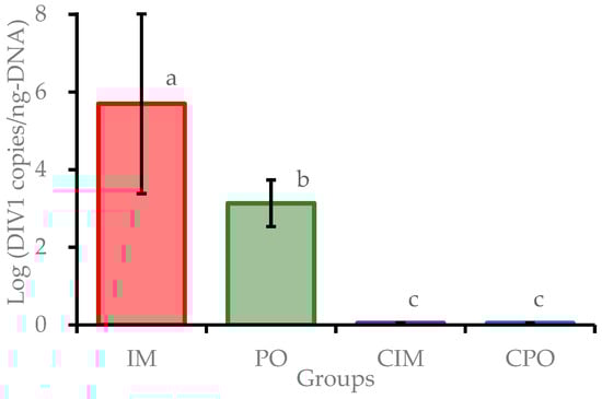 The following is available online at https://www.mdpi.com/1999-4915/11/4/387/s1, Figure S1: Positive data of DIV1 qPCR detection within 40 cycles in IM and PO groups.