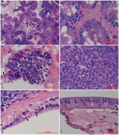 Histopathological examination of Exopalaemon carinicauda tissues infected with DIV1 and controls. Black arrows show karyopyknosis and white arrows show eosinophilic inclusions. Pictures (a,b) are hepatopancreas; (c,d) are hematopoietic tissues; and (e,f) are cuticular epithelium on which the cuticles were removed before dehydration. The pictures in the left column (a, c, and e) are the tissues of the infected prawn; the pictures in the right column (b, d, and f) are the tissues of the control prawn. HpT: hepatopancreatic tubule; HpS: hepatopancreatic sinus; Hm: hematopoietic tissue; Ep: epithelium; Cn: connective tissue; m: mitotic phase. Bar = 50 µm.