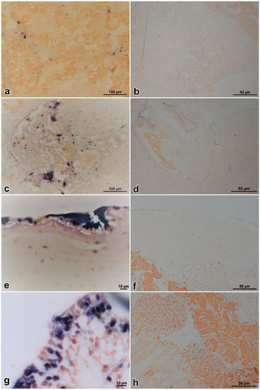 In situ DIG-labeling-loop-mediated DNA amplification (ISDL) micrographs of DIV1-infected and control Exopalaemon carinicauda. Hepatopancreas, stomach, cuticular epithelium, and hematopoietic tissue from a challenged prawn of the PO group, respectively (a, c, e, and g); hepatopancreas, stomach, cuticular epithelium, and hematopoietic tissue from a healthy prawn of the CPO group, respectively (b, d, f, and h). In pictures a, c, e, and g, blue-violet signals were observed in hepatopancreatic sinus, stomach epithelium, cuticular epithelium, and hematopoietic tissues of prawns, respectively. In pictures b, d, f, and h, no hybridization signal was seen in the same tissues of DIV1-negative E. carinicauda, except some non-specific signals on gastric sieve of stomach.