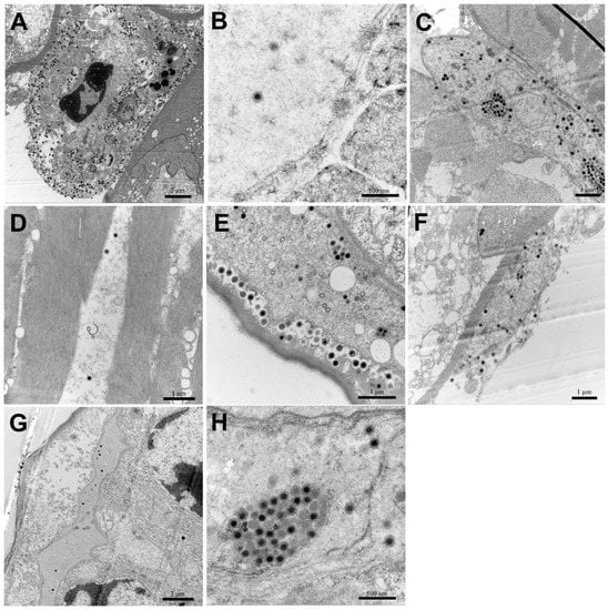 Transmission electron microscopy (TEM) of DIV1-infected Exopalaemon carinicauda. (A–E): hepatopancreatic sinus, pereiopods, uropods, muscle and gills, respectively, of a prawn in the IM group; (F and G): hepatopancreatic sinus and gills, respectively, of a prawn in the PO group; (H): cytoplasmic inclusions with a cluster of viral particles.
