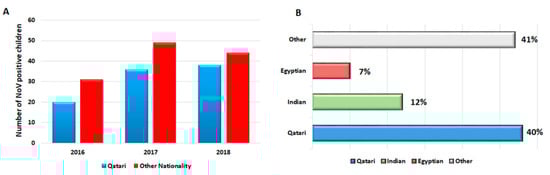 Qatar is a multinational country where more than 85% of its population are expats arriving from more than 60 countries around the globe []. This may present a threat for introducing various kinds of pathogens into the country, and hence it is necessary to run active surveillance programs to understand the epidemiology of these pathogens and prevent their spread locally. This becomes more important considering Qatar is preparing for World Cup 2022. Although screening for AGE agents is regularly performed in Qatar hospitals, little is known about their molecular characteristics and clinical outcomes. A previous prospective study from Qatar in 2013 [] identified NoV as the leading agent (28.5%) of AGE among adult and young patients admitted to emergency departments. However, the study was limited to one year and did not investigate the molecular and epidemographic characteristics of identified agents. Here, we report the incidence of NoV and its genotype distribution among children in Qatar during a two-year period. We also analyzed the correlation between circulating genotypes and clinical manifestations as well as the demographics of the studied population.