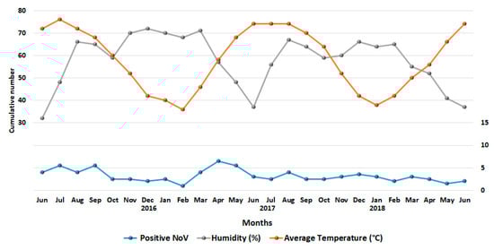 Stacked line chart denoting cumulative NoV infections during the study period, along with records of temperature and humidity are shown in Figure 2. Although the number of NoV infection occurred throughout the year, a drop in NoV infections was recorded between October and December (the winter season, average temperature: 22 °C and average humidity: 66%) comprising 25.4% (45/177) of the overall infections. Moreover, a rise in NoV cases was noticed in warmer months between May and August (average temperature: 37 °C, average humidity: 48%). The NoV reported cases among children during these four months represented 36.6% (64/177) of the total number. Such seasonal patterns of NoV infection were the same during the study period from June 2016 and June 2018.