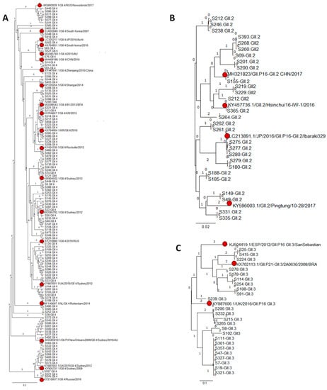 We were able to sequence and subsequently genotype all 177 NoV-positive samples included in our study. In order to analyze the circulating genotypes among NoV-infected children, we inferred the phylogenetic analysis along with the reference sequences from GenBank and Noronet. Two samples were documented as GI based on their clustering in the phylogenetic analysis; of which, one was designated as GI.3 and the other as GI.4. Identified G1.3 strain was closely related to the South Africa/2016 (MF182349.1) strain (95% nucleotide identity) [], while GI.4 shared sequence similarity (98% nucleotide identity) to the Venda/2015 (KY012280.1) strain [] (Supplementary Figure S1). On the other hand, nine different NoV GII genotypes were identified among the infected children, of which 62.2% were identified as GII.4. GII.4 strains clustered closely with emerging recombinant strain GII.P16-GII.4/RUS/Novosibirsk/2017 (MG892929), followed by GII.P4 New Orleans/2009/GII.4 Sydney/2012 (MG585810.1), GII.P4-GII.4/Rotterdam/2014 (MF140697.1), GII-4 /South Korea/2016 (EU003949.1), and GII.P16-GII.4 Sydney/2012 (KY887601), with 98% nucleotide identity (Figure 3A).