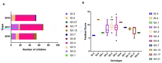 Importantly, we investigated the correlation between circulating genotypes and clinical outcomes using the Vesikari Clinical Severity Scoring System. Such clinical association was previously reported in a NoV outbreaks in Taiwan (during 2006 and 2007, and 2011 and 2012), but not in the MENA region countries. In Taiwan, severe clinical symptoms were associated with different GII.4 variants (GII.4 2012a and GII.4 2012b) []. Hospitalized children infected with these genotypes presented a significantly higher incidence of intestinal hemorrhage, occult blood in feces, as well as high fever >39 °C compared to earlier outbreaks with GII.4 Sydney 2012 and GII.4 2006b []. Among genogroup GI, the severity score was higher among the patient infected with GI.4 (score ≥ 10), compared to patient infected with GI.3 (score < 7). Moderate disease severity (score: 7 < score < 10) was also recorded among children infected with genotypes GII.4, GII.3, GII.2, GII.13, GII.17, and GII.7. Increased frequency of diarrhea and vomiting (average frequency: 4–5 times/day) were reported in children infected with certain GII.4 strains, specifically those similar to GII.P16-GII.4/RUS/2017 (MG892929), GII.4 Sydney/2012, GII.P4 New Orleans/2009/GII.4 Sydney 2012 (MG585810.1), GII.P16-GII.4 Sydney/2012 (KY887601), and GII.P16-GII.2 CHN/2017 (MH321823) (score ≥ 10). On the other hand, infection with NoV GII.3 in children <1 year of age resulted severe clinical illness (score ≥ 10) compared to other age groups/other genotypes. In fact, only limited number of reports had correlated the serenity of NoV infection with the genotype among children. Few studies suggested that NoV GII-4 genotype has a greater virulence compared to other NoV genotypes [,].