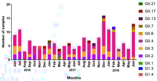 Seasonal distribution of NoV genotypes among children suffering from AGE. Y-axis represents the total number NoV-positive samples and x-axis represents circulating genotypes detected in affected children per month and year.