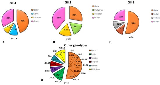 Pie chart representing the percentage of dominant NoV genotypes among top three nationalities. (A) Distribution of GII.4 (n = 110) among children from Qatar (orange color), Egypt (blue color), Pakistan (yellow color), and other nationalities (pink color). (B) GII.3 (n = 28) distribution among children from Qatar (orange color), Yemen (gray color), Sudan (brown color), and other nationalities (pink color). (C) GII.2 (n = 24) distribution among children from Qatar (orange color), Pakistan (yellow color), Philippine (light green color), and other nationalities (pink color). (D) Distribution of less prevalent genotypes (n = 15) in percentage with respect to their nationality. Qatar (orange color), Indian (green color), Tunisia (purple color), Belgium (marron color), Yemen (dark blue color), and Philippines (yellow color).