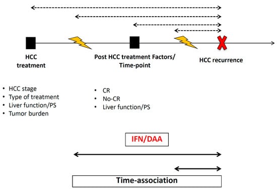 - Mashiba, T.; Joko, K.; Kurosaki, M.; Ochi, H.; Osaki, Y.; Kojima, Y.; Nakata, R.; Goto, T.; Takehiro, A.; Kimura, H.; et al. Does interferon-free direct-acting antiviral therapy for hepatitis C after curative treatment for hepatocellular carcinoma lead to unexpected recurrences of HCC? A multicenter study by the Japanese Red Cross Hospital Liver Study Group. PLoS ONE 2018, 13, e0194704. [Google Scholar] [CrossRef]