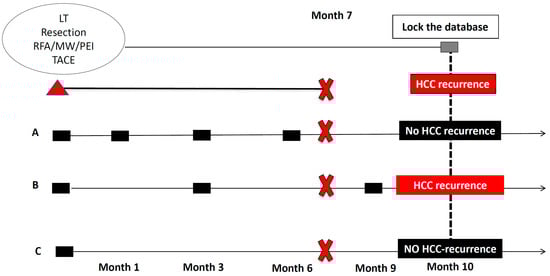 Impact of radiological evaluation on the rate of HCC recurrence reported. The red triangle represents the start point (the day of the treatment-LT, resection, RFA/MW/PEI or TACE-, the red cross represents the event (HCC recurrence) and the line between the two the time between treatment to HCC recurrence (7 months). The grey square represents the information inserted in the database at the day of the analysis (month 10). If this patient is evaluated in 3 different centers, which have a different radiological schedule to evaluate the radiological response, the information in the database will be different despite the patient being exactly the same. Centre A performs radiological evaluations at month 1, 3, and 6; Centre B at month-3 and 9; Centre C does not perform a defined radiological evaluation. However, all the centers have a database. Thus, if the patient develops a recurrence at month 7 and the database is locked at month-10, this patient will be considered a patient with HCC recurrence in center B because the information is in this database but no in centre A and B because the information is not in the database despite the fact that the event has already developed.