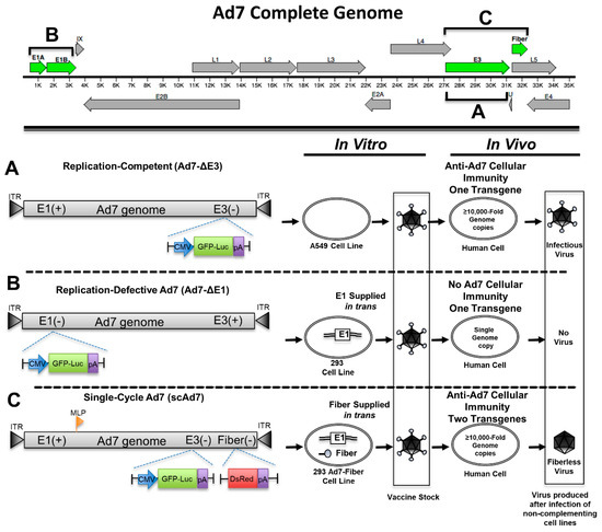Genomic organization of three Adenovirus type 7 (Ad7) viruses. The complete Ad7 genome can be seen at the top with the manipulated Adenovirus genes highlighted in green. The replication-competent virus platform has the nonessential E3 genes replaced with a GFP-Luciferase (GFP-Luc) expression cassette (A). The replication-defective Ad7 virus has the essential E1 genes deleted and replaced with a GFP-Luciferase expression cassette. This virus requires the E1 gene in trans from the 293 cells in order to replicate (B). The single cycle Ad7 (scAd7) virus has the E3 genes and fiber deleted (C). The E3 genes are replaced with a GFP-Luciferase expression cassette, and the fiber gene has been replaced with a DsRed gene running off the major late promoter (MLP) during replication. The scAd7 virus can only produce an infectious virus in Ad7 fiber complementing cell line. However, transduction of normal cells results in ≥10,000-fold genome amplification and only produces fiberless virus with severely impaired infectivity.
