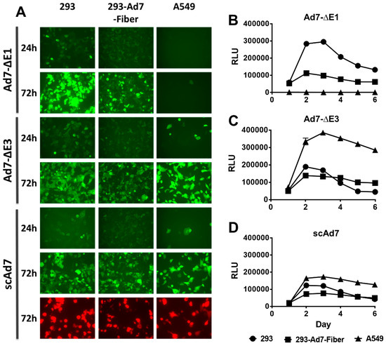 To examine reporter gene expression in complementing and noncomplementing cells lines, 293, 293-Ad7-Fiber, and A549 cells were infected with all three Ad7 viruses at 50 vp/cell. Images were taken at 24 and 72 h post-infection. The scAd7 virus showed equivalent GFP expression in all three cell lines. The replication-defective Ad7-ΔE1 virus showed the best GFP expression in the E1 complementing 293 cells, whereas the replication-competent Ad7-ΔE3 virus showed the greatest levels of expression in A549 cells (Figure 2A). This was further supported by evaluating the luciferase activity of the three Ad7 viruses at different time points (Figure 2B–D). As with the florescence expression, the Ad7-ΔE1 virus showed the strongest luciferase activity in 293 cells, while the Ad7-ΔE3 virus showed the strongest activity in A549 cells. Peak luciferase activity was observed at 3 days post-infection for all viruses.
