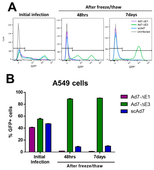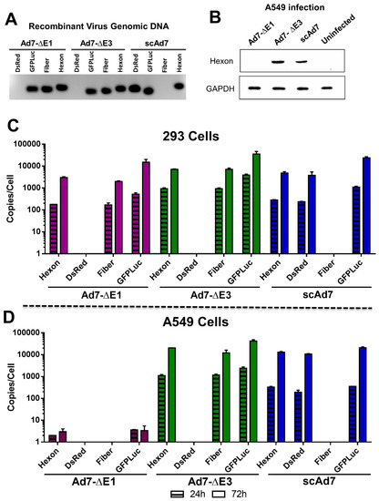 This scAd7 virus shows strong Ad7 hexon expression (Figure 3B) and strong gDNA replication (Figure 3D), even in noncomplementing A549 cell lines. These levels are comparable to that of the Ad7-∆E3 replication-competent virus. By contrast, the Ad7-dE1 virus showed undetectable hexon expression after infection of noncomplementing A549 cells. While we did not detect any late gene synthesis after infection with our E1 deleted virus, studies using a high MOI infection (>500) of A549 cells detected low late gene expression; however, it was not indicative of efficient virus replication [26].