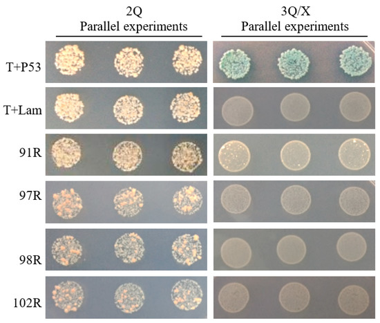 The formed yeast colonies during testing interactions between RGV-63R and four proteins by Y2H. Three parallel experiments were performed. 2Q: SD/-Trp/-Leu. 3Q/X: SD/-Trp/-Leu/-His/X-α-Gal. 91R, 97R, 98R, and 102R: RGV proteins, which are encoded by iridovirus core genes, respectively. T+P53: the positive control; T+Lam: the negative control.