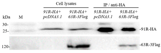 To further confirm interaction between RGV-63R and RGV-91R detected by Y2H, co-IP assays were performed. Briefly, HEK293T cells seeded in 10 cm dishes were cotransfected with 5 μg of pcDNA3.1-91R-HA and 5 μg of pcDNA3.1-63R-3Flag. As a control, 5 μg of pcDNA3.1-91R-HA and 5 μg of empty vector pcDNA3.1 were cotransfected in parallel. At 24 h post-transfection (hpt), cells were lysed with a radio immunoprecipitation assay (RIPA) buffer containing protease inhibitor cocktail (Roche), and cell lysates were incubated with Red Anti-HA Affinity Gel (Sigma, Sigma-Aldrich LLC., Santa Clara, CA, USA) overnight at 4 °C. The precipitates were collected by centrifugation, washed with ice-cold phosphate-buffered saline (PBS) three times, eluted with 40 μL of PBS, and finally subjected to Western blot analysis.