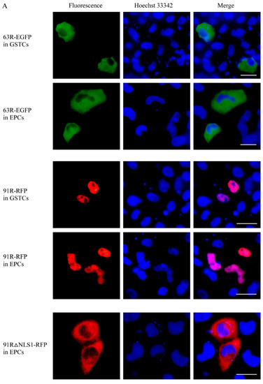 Fluorescence microscopy was carried out. The protein 63R-EGFP expressed alone localized in the cytoplasm of GSTCs or EPCs. The protein 91R-RFP expressed alone localized in the nucleus of GSTCs or EPCs. Obviously, the localizations of the same protein in GSTCs or EPCs from different species were consistent (Figure 3A).