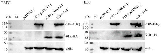 Western blot analysis of protein samples from cells transfected with plasmids for 24 h using anti-Flag and anti-HA. GSTC: in GSTCs expressing protein RGV-63R (63R + pcDNA3.1) or RGV-91R (91R + pcDNA3.1) alone or co-expressing two proteins RGV-63R and RGV-91R (63R + 91R), respectively. EPC: in EPCs expressing protein RGV-63R (63R + pcDNA3.1) or RGV-91R (91R + pcDNA3.1) alone or co-expressing two proteins RGV-63R and RGV-91R (63R + 91R), respectively. The empty vector pcDNA3.1 was used as a control. M: protein molecular mass marker.