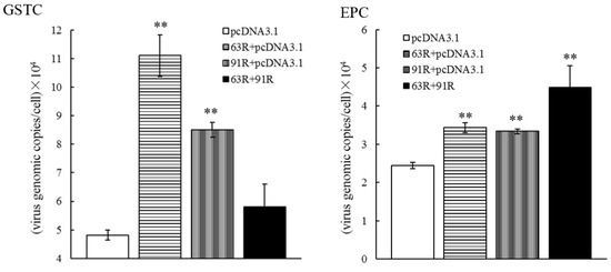 qPCR analysis of RGV genomic copies in GSTCs or EPCs. GSTC: in GSTCs expressing protein RGV-63R (63R + pcDNA3.1) or RGV-91R (91R + pcDNA3.1) alone or co-expressing two proteins RGV-63R and RGV-91R (63R + 91R), respectively. EPC: in EPCs expressing protein RGV-63R (63R + pcDNA3.1) or RGV-91R (91R + pcDNA3.1) alone or co-expressing two proteins RGV-63R and RGV-91R (63R + 91R), respectively. The empty vector pcDNA3.1 was used as a control. The transfected cells were infected with RGV, and RGV genome DNA was extracted from the cells at 48 hpi and quantified by qPCR. Each data point represents the average value of three independent infections. Error bars indicate standard deviations. ** represents p < 0.01.