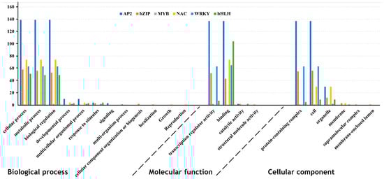 Orthologues are defined as genes in different genomes that have been created by the splitting of taxonomic lineages and are likely to retain the same function [,]. It has been widely accepted that the functions of the newly identified genes could be putatively predicted according to their orthologous counterparts []. In this study, we predicted the functions of the identified hop TFs using the orthologous genes from the well-characterized model plant A. thaliana. A large proportion of the hop TFs was assigned to have putative functions in diverse biological processes such as hormonal signaling, developmental processes, and abiotic and biotic stress responses (Table S4).