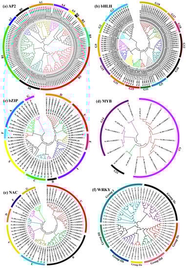 Unrooted phylogenetic tree representing the relationships and subfamily designations of the hop TF families along with the model species A. thaliana. The deduced amino acid sequences were aligned using the MUSCLE program, and the phylogenetic tree was constructed using the neighbor-joining method implemented in MEGA 7 software. The colored branch indicates the different subfamilies: (a) AP2, (b) bHLH, (c) bZIP, (d) MYB, (e) NAC and (f) WRKY.