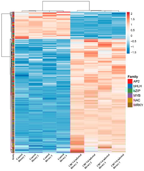 To gain an insight into the digital expression profiles of hop TFs during CBCVd infection, we have used our recently published CBCVd-responsive transcriptome []. Briefly, we mapped the clean reads to the unigenes dataset and normalized to the number of fragments per kilobase of exon per million mapped fragments (FPKM) by expectation maximization (RSEM) protocol using the Trinity software package []. The obtained count value was exported to the DESeq2 R package [] to determine differentially expressed gene transcripts (DEG) using the Benjamini and Hochberg approach [] for controlling the false discovery rate (FDR). The expression of TF encoding unigenes with an FDR adjusted p-value ≤ 0.05 and at least a two-fold change (≥2 or ≤2) was considered to be significantly differentially expressed between the CBCVd-infected and control libraries. The TF gene expression was visualized using a heatmap with clustering drawn using the online Clustvis tool [].