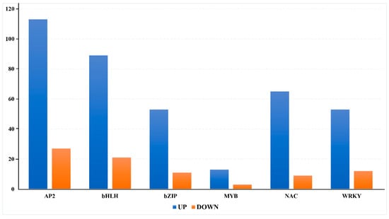 To understand the intricate differential modulation of hop TFs during CBCVd infection, we analyzed the TF digital gene expression levels in CBCVd-infected and control samples using FPKM. The result revealed the massive differential modulation of hop TFs, with FPKM values ranging from 0.14 to 894.55 in CBCVd infected libraries (Table S4). We constructed an expression profile heat map based on the expression data in different libraries of hop TFs (Figure 3). Most of the TFs (440, or 95%) depicted a significant differential expression pattern (p ≤ 0.05, logFC ≥ 2 or ≤ −2). Of the total 466 TFs, a total of 113 (AP2; 80.70%), 53 (bZIP; 82.8%), 85 (bHLH; 80.10%), 13 (MYB; 81.67%), 65 (NAC; 87.83%) and 53 (WRKY; 80.30%) TFs were upregulated, while 27, 11, 21, 3, 9 and 13 TFs were downregulated, respectively (Figure 4), in this study reflecting their concerted activator or repressor roles during CBCVd infection.