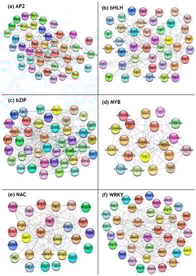 Network analysis of CBCVd-responsive hop TFs in a cluster of orthologous (COG) mode using the STRING v11.0 database showing the interconnected network of hop TFs with other proteins involved in the defense response, with a confidence score ≥0.7. The top ten interactions were extracted using the cytohubba app and visualized using Cytoscape software (a) AP2 family, (b) bHLH family, (c) bZIP family, (d) MYB, (e) NAC, and (f) WRKY.