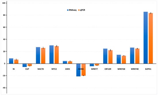Based on the orthologous relationships and putative known functions, we selected 11 different CBCVd-responsive hop TFs for the qRT-PCR validation. The analysis revealed a high degree of correlation between the RNA-Seq digital gene expression and the qPCR expression statistics (Figure 6), implying the high quality and reliability of our transcriptome datasets. In addition, the differential expression profile of the selected hop TFs further strengthens their candidature in transcriptional reprogramming during CBCVd infection in the hop. For instance, the WRKY (WRKY68&40), bZIP (bZIP61) and NAC (NAC78) TFs depicted a significant up-regulation, which was consistent in both the RNA-Seq and qRT-PCR analysis. Similarly, the CUP-SHAPED COTYLEDON 3 (NAC), SHINE 2 (AP2) and WRKY7 TFs showed a similar trend of down-regulation in the transcriptome and qRT-PCR analysis.