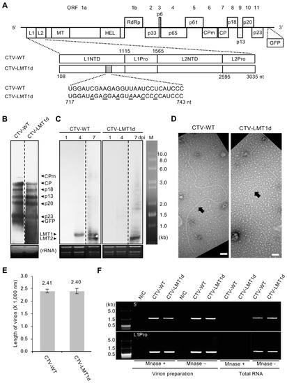 At the next step, we investigated whether prevention of LMT1 production had any effect on the assembly of virus particles. Closterovirus virions are built of two coat proteins: the CPm, which covers a 5′-terminal region of the genomic RNA (in CTV, this region is ~630 nt), and the CP that encapsidates the rest of the genome [30,49,50,51]. Additionally, it has been suggested that the p65 and p61 proteins participate in virion formation as well and associate with the CPm-CP transition zone [52]. The substituted nucleotides in CTV-LMT1d are positioned in the proximity of the genomic region corresponding to that transition area, and, thus, their alteration could have a negative effect on the encapsidation process. To assess virion formation by CTV-LMT1d, virions isolated from the N. benthamiana leaves infiltrated with the corresponding infectious clone were examined using transmission electron microscopy (Figure 1D). As we observed, the average length of virions isolated from the CTV-LMT1d-inoculated leaves was not significantly different from that of the CTV-WT virions (Figure 1E; Tukey’s HSD test post hoc, p values < 0.01), which suggested that mutations within the LMT1 CE did not affect virion assembly. To further confirm proper packaging of the CTV-LMT1d genome at the LMT1 CE region, purified virions were treated with a micrococcal nuclease (MNase) and examined by RT-PCR to verify whether the genome was protected from the MNase activity (Figure 1F). Using a pair of oligonucleotides designed to amplify the region of the genome that is located downstream of the LMT1 CE and encodes the L1 protease domain (Figure 1A, L1Pro) we were able to obtain the expected fragment in the samples prepared from the CTV-WT- or CTV-LMT1d-infiltrated leaves. This suggested that the corresponding regions of their genomes were protected from the degrading enzyme by being encapsidated within the virions (Figure 1F, bottom panel labeled as “L1Pro”). Furthermore, RT-PCR reactions with a pair of oligonucleotides amplifying the 5′-terminal genomic segment encompassing sequences upstream of the LMT1 CE also resulted in amplification of the respective products in the CTV-WT and CTV-LMT1d samples, confirming proper encapsidation of the 5′-terminal regions of the two viral genomes (Figure 1F, top panel labeled as “5′”). Taken together, these results confirmed that mutations introduced to generate CTV-LMT1d successfully disabled production of the LMT1 sgRNA without disturbing other fundamental virus properties related to its replication and assembly.