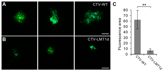 Assessment of CTV-WT (A) and CTV-LMT1d (B) cell-to-cell movement in the N. benthamiana leaves. Images show three representative GFP-expressing foci observed at 21 days after rub-inoculation of equal-concentration virion suspensions of CTV-WT or CTV-LMT1d in the mesophyll cells of N. benthamiana plants using fluorescence microscope. Bars = 0.1 mm. (C) Quantitative measurement of GFP fluorescence in the images shown in (A) and (B). Each bar represents a mean value +/− standard error of the mean calculated from all images of observed GFP foci (n = 59 and 32 for CTV-WT and CTV-LMT1d, respectively). Statically significant differences determined by Student’s t-test, p < 0.01, were denoted by asterisk (**).