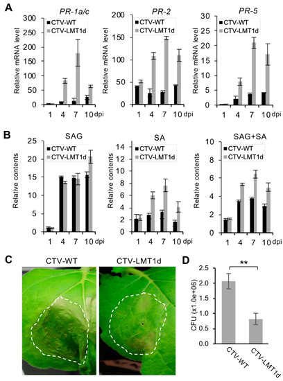 In order to establish a successful infection, a virus must counter-act host defense responses. In plants, SA-mediated signaling pathways can suppress all three main stages in virus infection: replication, cell-to-cell movement, and long-distance movement [17]. Furthermore, it has been shown that SA signaling is involved in plant defense against CTV [55]. Therefore, we next tested if the host immune responses to CTV-WT and CTV-LMT1d were different. Before assaying the SA levels, we first examined the mRNA levels of the three PR genes associated with the SA pathway—the PR-1a/c, PR-2, and PR-5 genes—in the leaves of N. benthamiana plants infiltrated with CTV-WT or CTV-LMT1d (Figure 4A). RT-qPCR quantification using total RNA extracted from the samples collected at 1, 4, 7, and 10 dpi demonstrated that at all time points starting at 4 dpi the three PR genes were expressed at significantly higher levels in the plants infected with the LMT1-deficient virus compared to those in the plants infected by CTV-WT. Since the difference in the PR genes expression was significant, we next analyzed the total SA levels composed of free SA and SAG using tissue samples from the above plants (Figure 4B). Quantification of the SA accumulation showed a significant difference between CTV-WT and CTV-LMT1d, with the SA accumulation in the CTV-LMT1d-infected tissue being two to three times higher than that in the CTV-WT-infected tissue (Figure 4B).