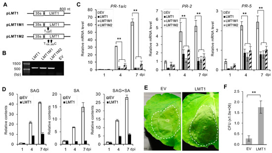Suppression of SA-mediated defense response by the LMT1 RNA. (A) Schemes of the expression constructs of LMT1 (pLMT1) and its mutants (pLMT1M1 and pLMT1M2). (B) RT-PCR analysis of the LMT1 transcripts. LMT1-specific primers were used to amplify the transcripts from the total RNA extracted from N. benthamiana plants infiltrated with the constructs shown in (A) along with an empty vector. The size of the expected amplification product was 700 bp. (C,D) Comparison of the relative mRNA levels of PR-1a/c, PR-2 and PR-5 genes (C) and relative contents of salicylic acid (SA) and glucose-conjugated SA (SAG) (D) upon infiltration of N. benthamiana with pLMT1 and its mutants at 1, 4, and 7 dpi. Open bar, “empty-vector” Agrobacterium control (EV); black bar, pLMT1; grey bar, pLMT1M1; bar filled with diagonal stripes, pLMT1M2. Statically significant differences determined by Student’s t-test, p < 0.01, were denoted by asterisks (**). (E) Symptoms of P. syringae infection in N. benthamiana. Plants pre-infiltrated with a LMT1 construct or empty vector were challenged with P. syringae at 4 dpi and assayed at 3 days after the challenge. (F) Titers (CFU per leaf disc) of P. syringae in the leaves shown in (E). Sample analysis was done as described in Figure 4.
