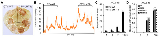 As shown previously, SA can promote plant resistance to viruses (reviewed in [12]). SA inhibits the respiratory electron transport chain [63,64] resulting in the increase in reactive oxygen species (ROS) which subsequent signaling is proposed to trigger the induction of nuclear genes that affect viral replication and movement [17]. Based on this, we hypothesized that the higher SA level in the leaves infiltrated with the virus lacking LMT1 could have resulted in a more severe ROS accumulation compared to that in leaves infected by CTV-WT. To confirm this, the leaves infiltrated with CTV-WT and CTV-LMT1d were stained with DAB, which detects hydrogen peroxide, the most abundant ROS (Figure 6). For this test, the infiltrated leaves were collected at 7 dpi, a time point in the early infection stage at which the difference between the titers of the two viruses was not statistically significant (Figure 2E), yet LMT1 had already accumulated in a large amount in the wild-type virus-infected cells (Figure 1C). As a result, the areas infiltrated with CTV-LMT1d showed the development of dark brown staining compared to the light yellow-brown color in the areas infiltrated with CTV-WT (Figure 6A). The intensity of the DAB staining measured over a single line plot (Figure 6A; black dotted line) demonstrated higher values of brown pigmentation in the CTV-LMT1d-infiltrated region (Figure 6B). These results indicated that during the establishment of the CTV-LMT1d infection ROS burst was much more extensive compared to that upon the development of the CTV-WT infection.