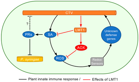 Schematic model of the CTV interplay with the plant innate immunity. CTV invasion triggers innate immune responses initiated by SA, which acts against virus accumulation and movement. Early production of LMT1 inhibits the accumulation of salicylic acid and also enhances the expression of an alternative oxidase, which suppresses the accumulation of reactive oxygen species. Plant innate immune responses are indicated in black lines. The effects by LMT1 are indicated in red lines. A possible effect of the PR proteins on the CTV infection is indicated as a black dotted line. PR, pathogenesis-related proteins; SA, salicylic acid; AOX, alternative oxidase; ROS, reactive oxygen species.