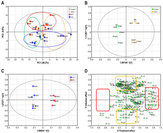 Due to the large number of variables, the PLS could not clearly reveal the metabolites accumulated after the BTH treatment. Therefore, two orthogonal projections to latent structures-discriminant analyses (OPLS-DA) were applied separately to specifically examine the metabolic changes produced by the infection (healthy-CEVd infected; Figure 2B) or the chemical action (H2O-BTH; Figure 2C). In the score plot of both OPLS-DA models, the samples inoculated by CEVd or sprayed with BTH were clearly separated from their respective controls. These two OPLS-DA models (infection and chemical treatment) were integrated by a shared-and-unique-structures (SUS)-plot (Figure 2D) with the X-axis corresponding to BTH-treatment and the Y-axis to CEVd infection. In this analysis, the diagonally-aligned metabolites were of equal importance and shared by the two models, and the metabolites located along the axis were specifically altered in CEVd-infected (yellow boxes) or BTH-treated tomato plants (red boxes), respectively.