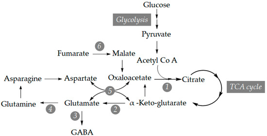 The metabolic inter-relationship between plant metabolism of malate, aspartate, GABA and glucose. 1: Citrate synthase (mCS), 2: Glutamate dehydrogenase (GDH), 3: Glutamate decarboxylase (GAD), 4: Glutamine synthetase (GS), 5: Aspartate aminotransferase (AST), 6: Fumarase (FH).