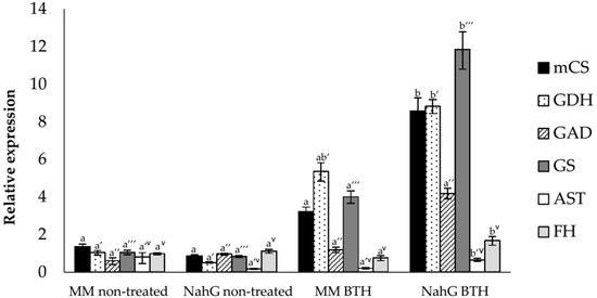 Expression levels of the tomato citrate synthase (mCS), glutamate dehydrogenase (GDH), glutamate decarboxylase (GAD), glutamine synthetase (GS), aspartate aminotransferase (AST), and fumarase (FH) genes in non-treated and BTH-treated (BTH) Money Maker and NahG mock tomato plants at 2.5 wpi, determined by real-time qRT-PCR analysis. Values were first normalized to the actine expression level. Expression levels are represented as mean ± standard error of three biological repetitions. An ANOVA analysis was performed for each gene, among the four samples (MM-non-treated, MM-BTH, NahG-non-treated and NahG-BTH). Different letters indicate the statistical significance differences among the four samples with p-value < 0.05.