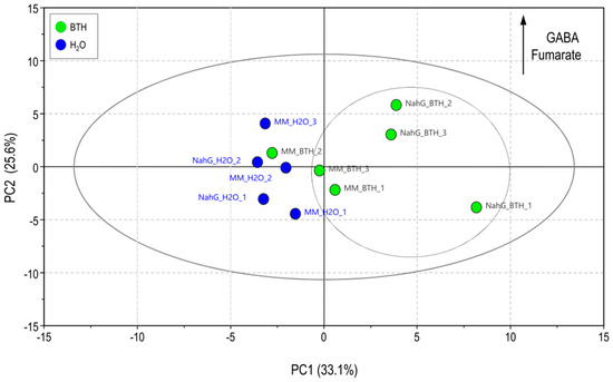 Following the univariate statistical analysis of mass spectral data, a comparison of all the samples involved in the study was performed through a PCA analysis. An evident separation of BTH-treated NahG plants from all the others was observed by the score scatter plot of PCA, clearly showing that these transgenic plants undergo a greater metabolic change than its parental cultivar after chemical spray (Figure 5). In this case, the discriminant metabolites were GABA and fumarate which remained statistically over-accumulated in NahG tomato leaves after 48 h of BTH treatments. All of these results appear to indicate that GABA could play a role in the BTH-mediated recovery of NahG tomato plants infected with CEVd.