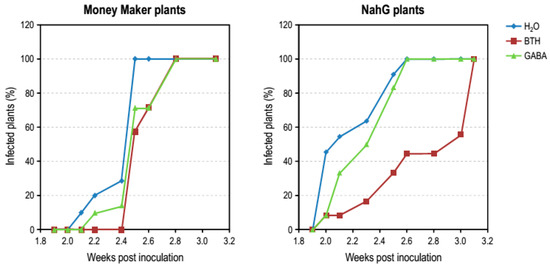 To explore the implication of GABA in the BTH mechanism of action, Money Maker and NahG tomato plants infected by CEVd were pre-treated with 1 mM GABA, and a comparative study of the development of symptoms in CEVd-infected plants was carried out at the indicated time points. The number of tomato plants showing symptoms of the viroid disease was recorded during progression of infection. Applications of GABA in CEVd-inoculated Money Maker plants delayed the initial presence of symptoms as well as BTH (Figure 6, left panel). This effect was more evident in NahG transgenic plants (Figure 6, right panel). In fact, 2 weeks after viroid infection, the GABA protective effect was the same as that observed for BTH in NahG plants. However, a loss in the effectiveness of GABA treatments was observed over the time for both Money Maker and NahG tomato plants. Similar results were observed by analyzing symptom severity in NahG plants (Figure S1).