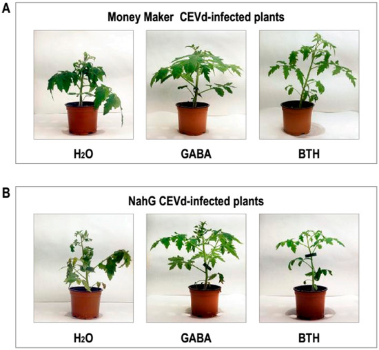 Growth of (A) Money Maker and (B) NahG plants following treatment with GABA or BTH and CEVd inoculation. Representative phenotype observed un infected plants 3 weeks after CEVd inoculation, and in equivalent plants pre-treated with 1 mM GABA or 1 mM BTH.
