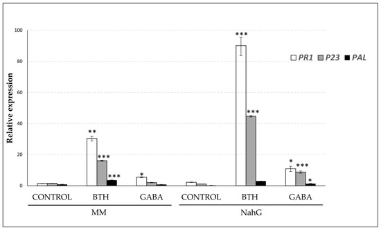 Expression levels of the tomato PAL, PR1 and P23 genes in Money Maker and NahG tomato plants, non-treated (CONTROL) and 48 h after BTH or GABA treatments. Values were first normalized to the actin expression level. Expression levels are represented as mean ± standard error of three biological repetitions. Asterisk (*), double asterisks (**) and triple asterisks (***) indicate significant differences between chemically-treated and non treated plants with p < 0.05, p < 0.01 and p < 0.001, respectively.