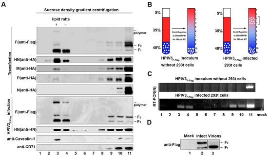 3.4. The F Protein, HN Protein, and Virus Genome Localized in Lipid Rafts in HPIV3F-Flag-Infected Cells