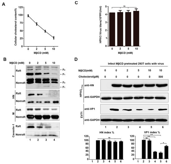 Knowing that the virus genome RNA, F protein, and HN protein can move into the lipid raft layer in virus-infected cells, the potential function of lipid rafts in the life cycle of HPIV3 was detected by treating 293T cells with various concentrations of MβCD, which is a drug that can destroy lipid rafts of cell plasma membrane by effectively depriving them of cholesterol []. First, we examined the total cholesterol content of cells that were treated with various concentrations of MβCD using an AmplexTM Red Cholesterol Assay kit. The results show that, when the concentration of MβCD reaches 5 mM, the total cellular cholesterol content has been reduced by half, and, when the concentration of MβCD reaches 10 mM, the total cell cholesterol content has decreased by about 75% (Figure 4A). Second, in order to prove that MβCD can indeed destroy lipid rafts, 293T cells that were transfected with the F protein, HN protein, and M protein were exposed to increasing concentrations of MβCD, and the distribution of viral proteins and endogenous Caveolin-1 in the lipid raft layers were examined by WB. The results show that, as the MβCD concentration increased, the viral proteins and endogenous Caveolin-1 gradually decreased in lipid rafts, which suggests that MβCD can effectively destroy lipid rafts (Figure 4B). Subsequently, we analyzed the generation of HPIV3F-Flag virions that were treated with different concentrations of MβCD for 30 min. at 37 °C. We added serum-free medium to the cell culture dish after adding cells treated with MβCD in order to avoid the effect of cholesterol in the culture medium on the function of lipid rafts, and 6 h post-infection, the supernatants were collected to detect viral titers. The results show that there is no effect on viral budding when cells are treated with MβCD, suggesting that viruses released from MβCD-treated cells still have sufficient cholesterol, which demonstrates that HPIV3 does not directly utilize the lipid rafts of cell membranes for assembly and budding (Figure 4C). Afterwards, EV71 was taken as a positive control, for which it has been reported that the entry of a virus is dependent on the cell membrane lipid rafts to detect whether damage to cell membrane lipid rafts affects HPIV3 infection []. We treated cells with MβCD before infection, and. at 24 h post-infection, the cells were lysed, as described in Section 2 and subjected to western blot with anti-HN and anti-GAPDH antibodies (Abs). Our results show that the destruction of cell membrane lipid rafts with MβCD affects the infection of EV71, but not HPIV3, which means that the infection of HPIV3 is not dependent on cell membrane lipid rafts (Figure 4D).