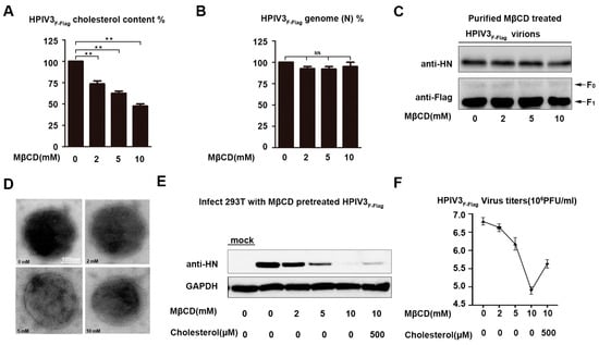Infectivity of cholesterol-depleted HPIV3 was markedly reduced. (A) HPIV3F-Flag virus was pretreated with various concentrations of MβCD or left untreated, and then, the virions were repurified using a sucrose cushion in order to analyze the cholesterol content using an AmplexTM Red Cholesterol Assay Kit according to the manufacturer’s protocol. (B) The relative number of the genomes of the sucrose-cushion-repurified virus that was treated with MβCD and cholesterol were detected by Q-PCR. (C) The number of the HN and F proteins on the repurified MβCD-treated HPIV3 virions were detected by WB. (D) Electron microscope image of MβCD-treated virus. The sucrose-cushion-repurified HPIV3 virus that was treated with MβCD was negative stained and observed by electron microscope. (E) 293T cells were infected with sucrose-cushion-repurified virus that was treated with various concentrations of MβCD and cholesterol, and at 24 h post-infection, the cell lysate was analyzed by WB with anti-HN and anti-GAPDH Abs. (F) Viral titers of MβCD-treated or untreated HPIV3. Error bars, mean ± SD of three experiments. Student’s t test; * p < 0.05; ** p < 0.01; *** p < 0.001; **** p < 0.0001; NS, non-significant.