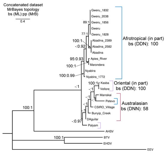- Bodkin, D.K.; Knudson, D.L. Genetic relatedness of Palyam serogroup viruses by RNA-RNA blot hybridization. J. Gen. Virol. 1986, 67, 683–691. [Google Scholar] [CrossRef]