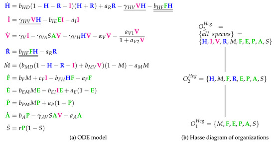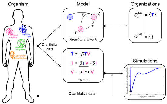 Here, we present an approach to understand the overall structure of these models that allows them to be related to each other in a simple way. To this end, we apply chemical organization theory [10,11] to obtain a hierarchical decomposition of each model into chemical organizations. A chemical organization is a sub-set of species (i.e., dimensions or model components, like, uninfected cells or viruses) that cannot generate any other species (property of closure) and that can self-maintain its own species, i.e., any species consumed by a process within the organization can be regenerated by a process within the organization. The organizations of an ODE model are rigorously related to its long-term dynamics in the following way: Given a stationary state of the ODE model, the set of species with strictly positive concentrations must be an organization [10]. The same is true for all practically relevant periodic and chaotic attractors [12]. Note that the advantage of this approach is that decomposition into organizations is based solely on the model structure (i.e., reaction rules) and thus is independent of kinetic details, like rate constants. The relation between measured data, ODE model, and organizations is depicted in Figure 1.