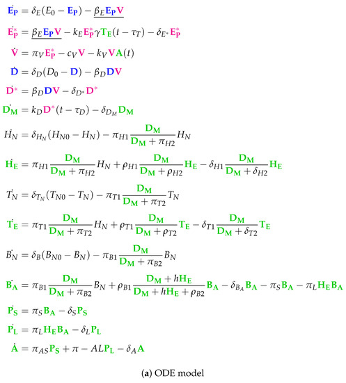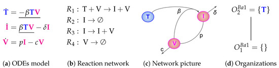 For simplicity, the models’ variable names also denote the related species. For example, V denominates not only the number of viruses in the ODE model (Figure 2a), but also the virus itself (e.g., Figure 2b).