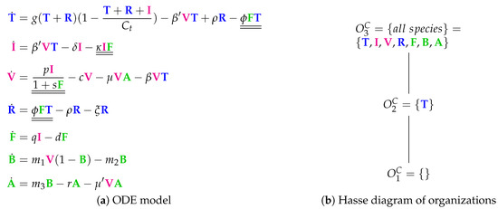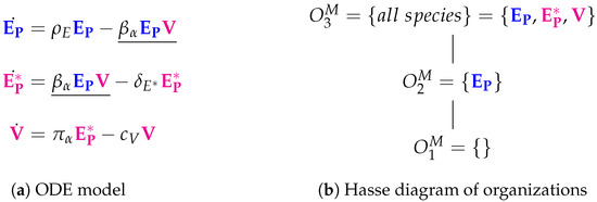 In the Hasse diagram of organizations (Figure 3b), a new “full” organization appears, which contains all three species. Thus, organization reflects the slight difference between the two models: in the Baccam Model, uninfected target cells T are only the susceptible ones and can not increase in number, but in the Miao Model uninfected cells are reproduced repeatedly by the organism. Thus, in the Baccam Model, infection is limited inherently by the limited number of uninfected target cells, while in the Miao Model the limitation of an infection in time and number of infected cells and viruses depends on other mechanisms: